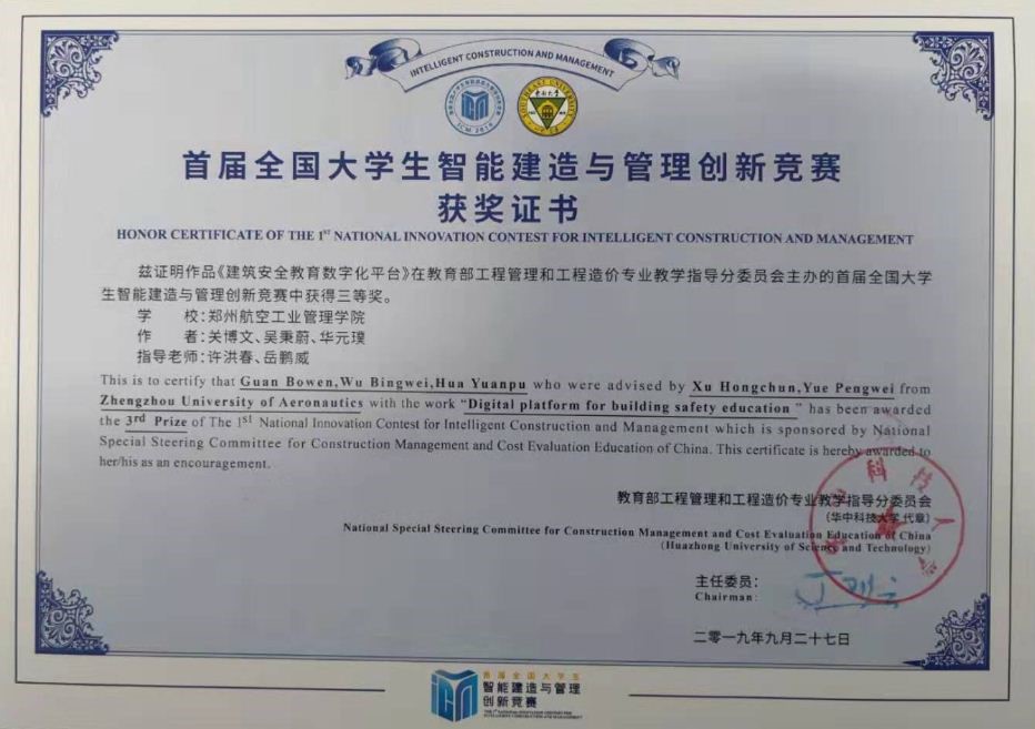 2019年9月13-15日,由教育部工程管理和工程造价专业教学指导分委员会主办,东南大学、东南大学土木工程学院和江苏省土木建筑学会承办,以智慧工地与可持续建设管理为主题的,面向全国高校工程管理及相关专业本科生的一项科技竞赛活动--“首届全国大学生智能建造与管理创新竞赛”在东南大学举行。土木建筑学院2016级关博文、吴秉蔚及2017级研究生华元璞三位同学在指导老师许洪春、岳鹏威的带领下组成“ZUA筑梦”团队积极参加比赛并荣获全国三等奖。