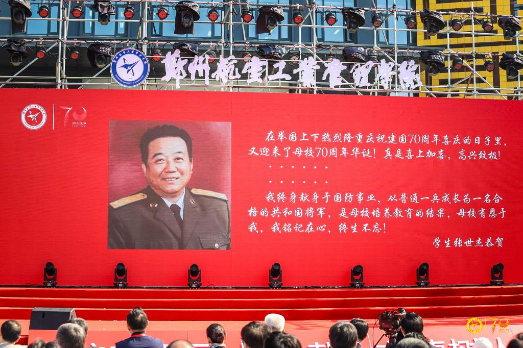 工作人员宣读了我校54届校友、空军少将张世杰,以及曾在我校担任过党委书记已届85岁高龄的林维钦写给母校70周年华诞的贺信。张世杰表示,自己入伍后一直牢记母校老师的教诲,坚持听党的话,跟党走,国家需要就是个人志愿。母校不仅传授为人民服务的知识,更重要的是在政治上培养教育自己如何报效国家,在思想上为自己终身献身国防事业牢牢扎下了根。感恩母校,衷心祝愿母校建设好、发展好!林维钦表示,郑州航院办学的历程,走了整整七十个年头,春华秋实桃李满天下,可喜可贺。祝愿学校越办越好,更上一层楼。